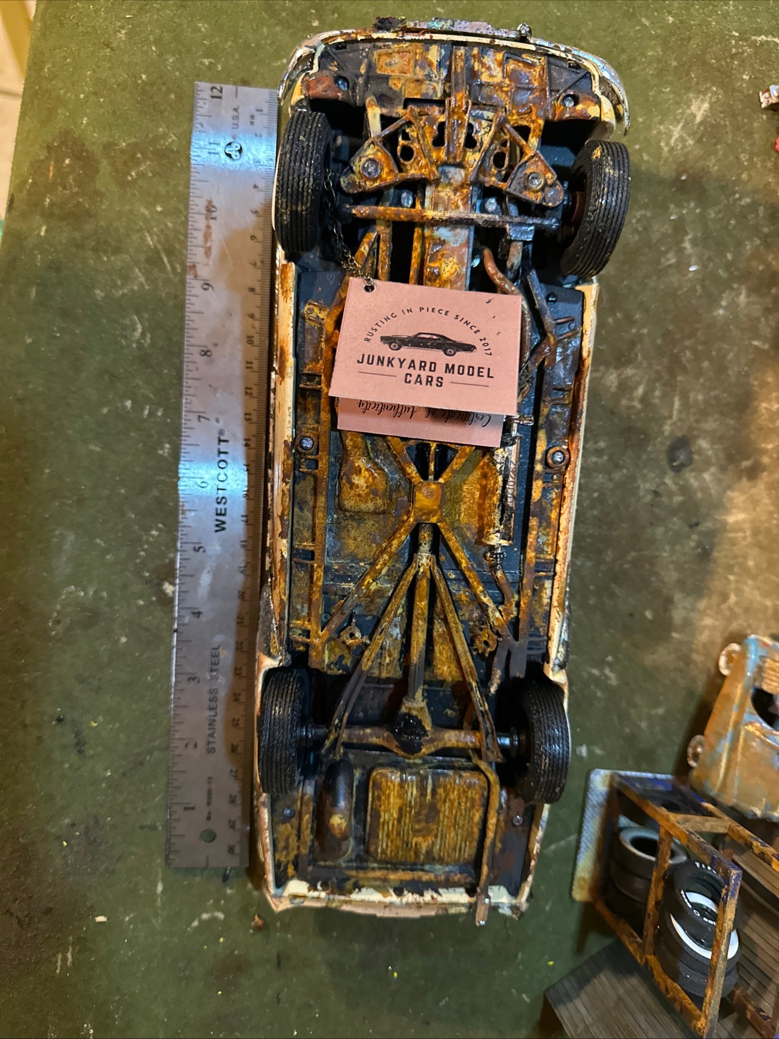 Using a Multi-step rusting process the artist redid the interior to show rotting then heavily rusted the body, interior, undercarriage, in the trunk and under the hood! The car is enhanced it with real rust so it would take on the appearance of a car left for discovery.