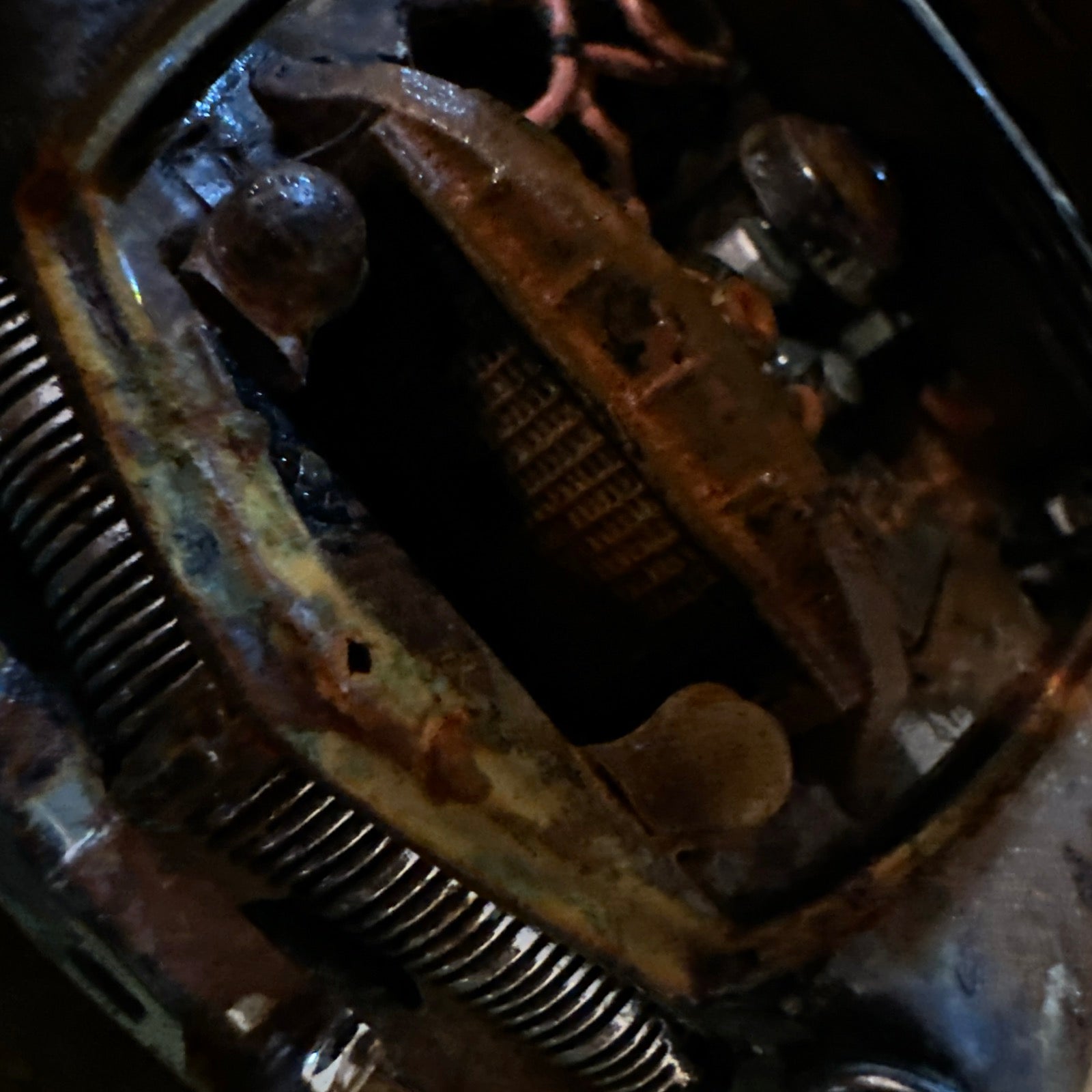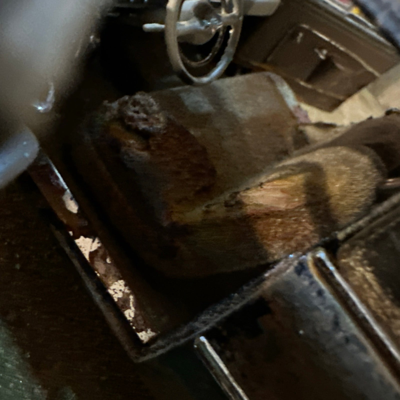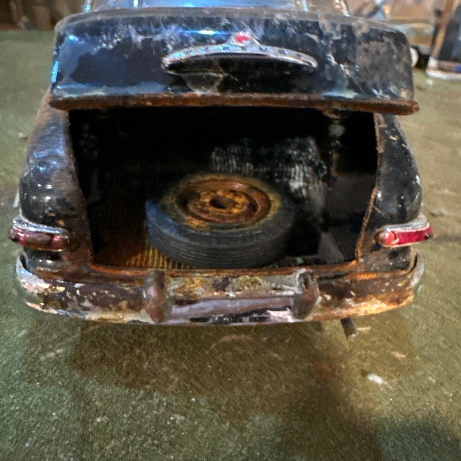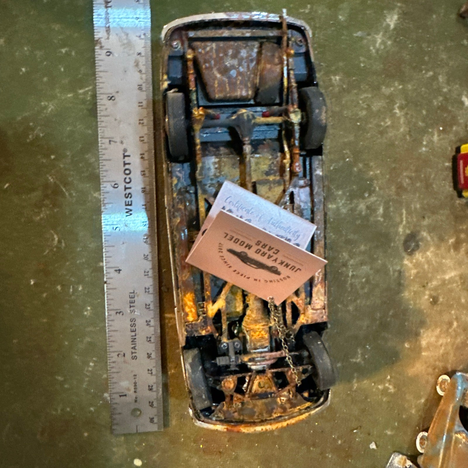 Using a Multi-step rusting process the artist redid the interior to show rotting then heavily rusted the body, interior, undercarriage, and under the hood as well as the trunk!