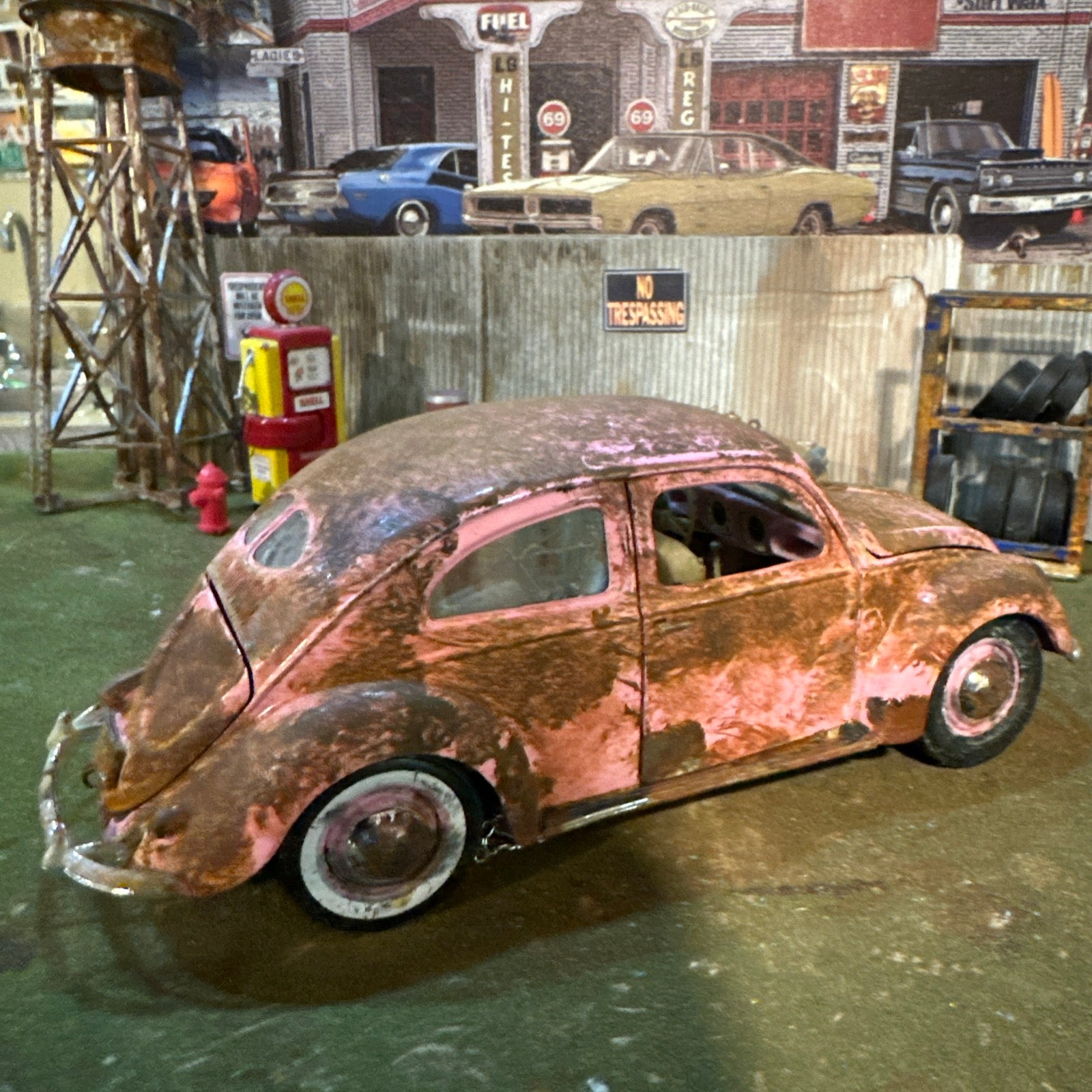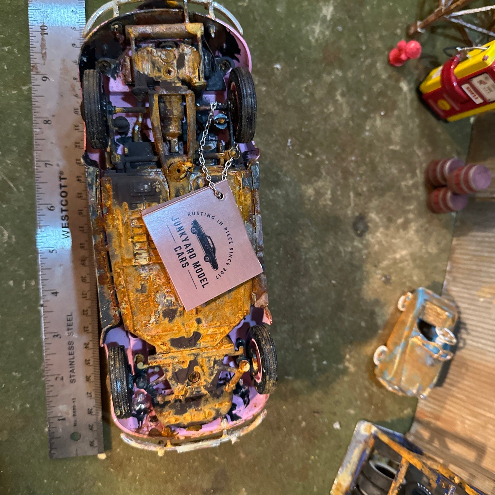 Starting with a very highly detailed 1/18 scale, the car was aged to perfection including a rotting chassis, interior and engine bay as well as paint decay. All done using a multi step rusting process.