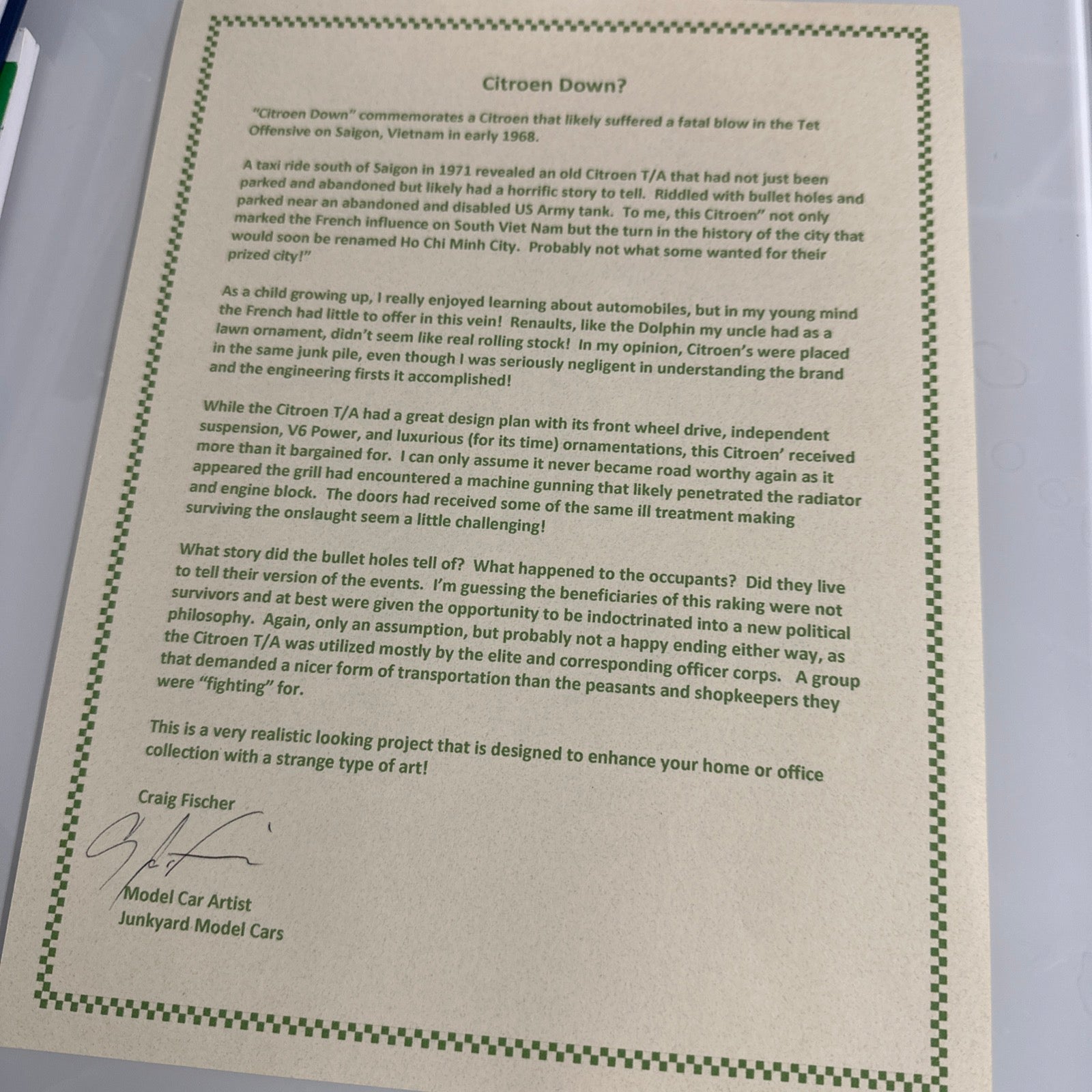 A highly detailed and custom built 1:18 scale model that will turn heads in your display or diorama. Built to commemorate a Citroen T/A that likely suffered destruction during the Tet Offensive on Saigon, South Vietnam in 1968!