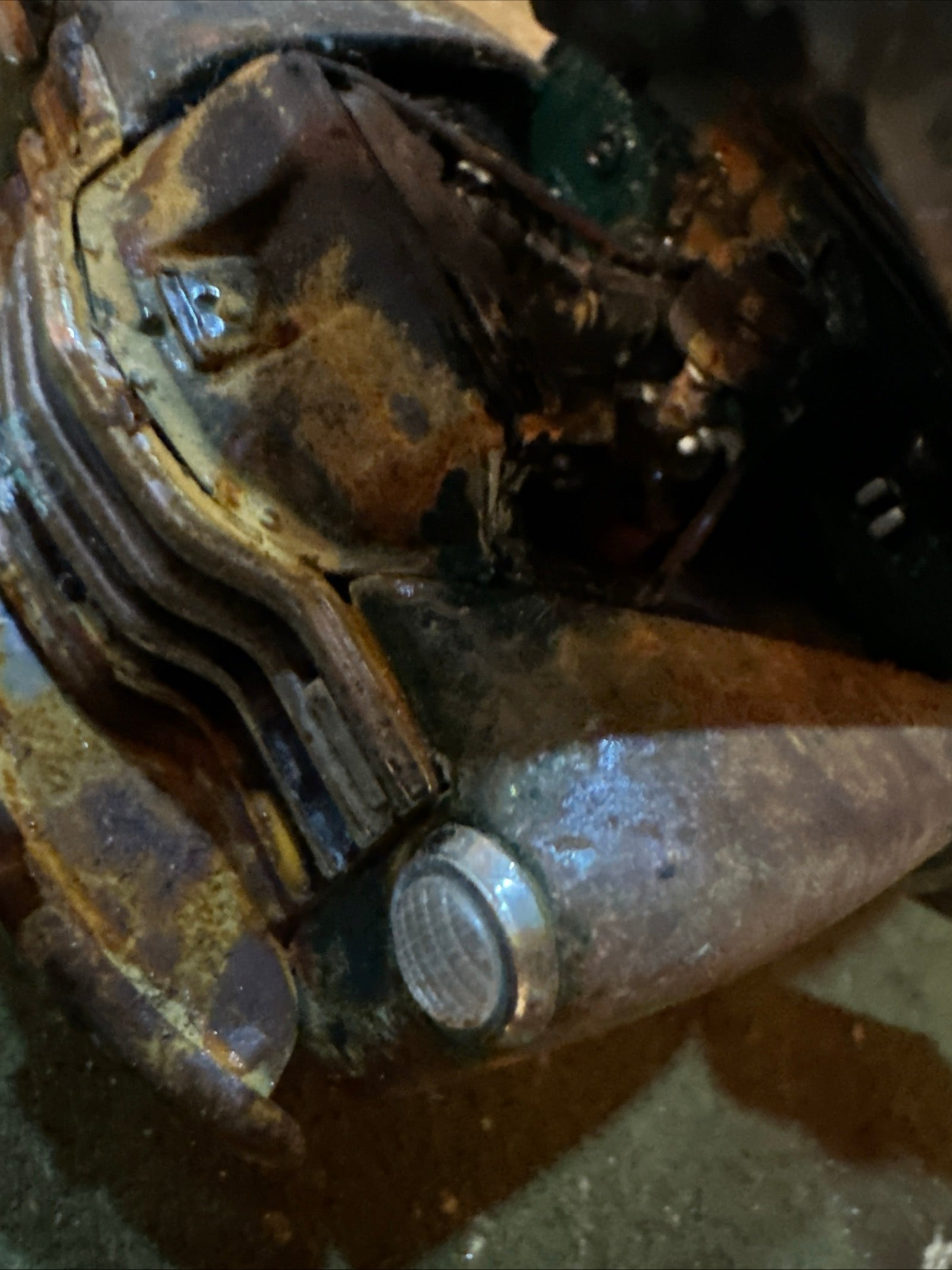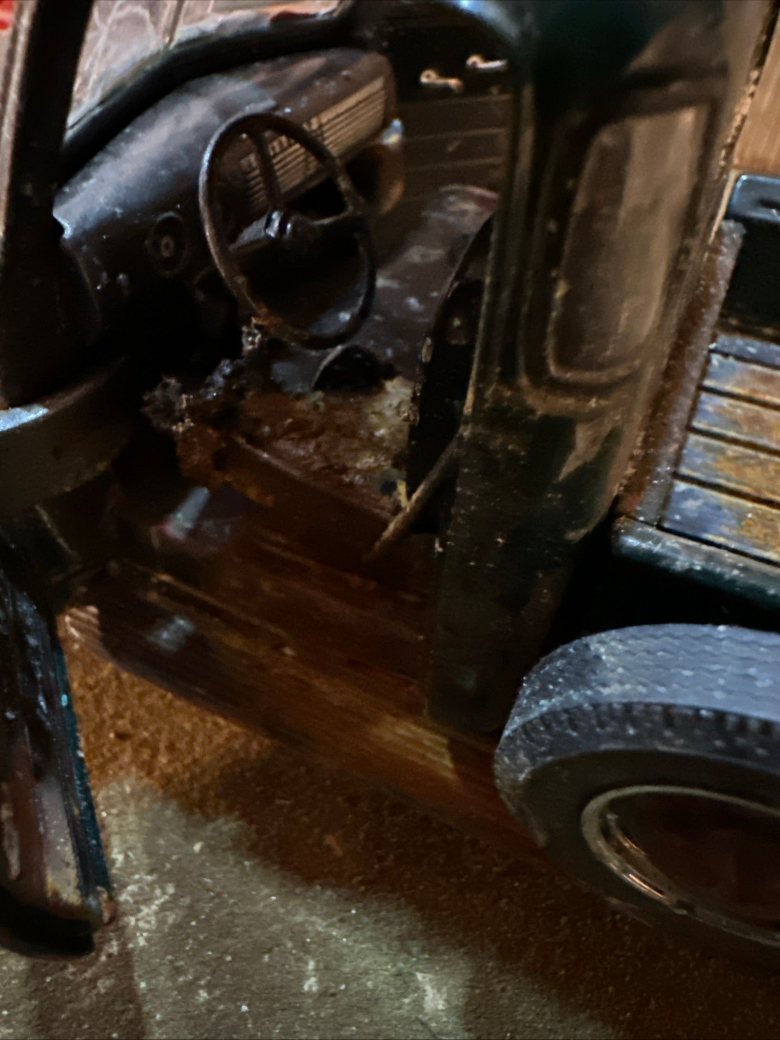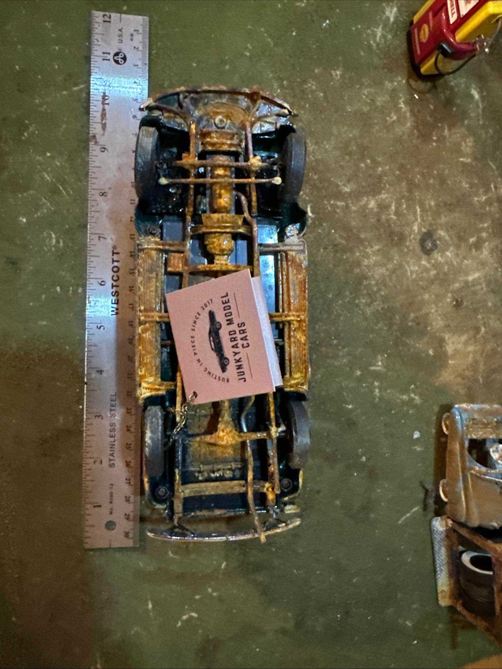Using a Multi-step rusting process the artist redid the interior to show rotting then heavily rusted the body, interior, undercarriage, and under the hood!