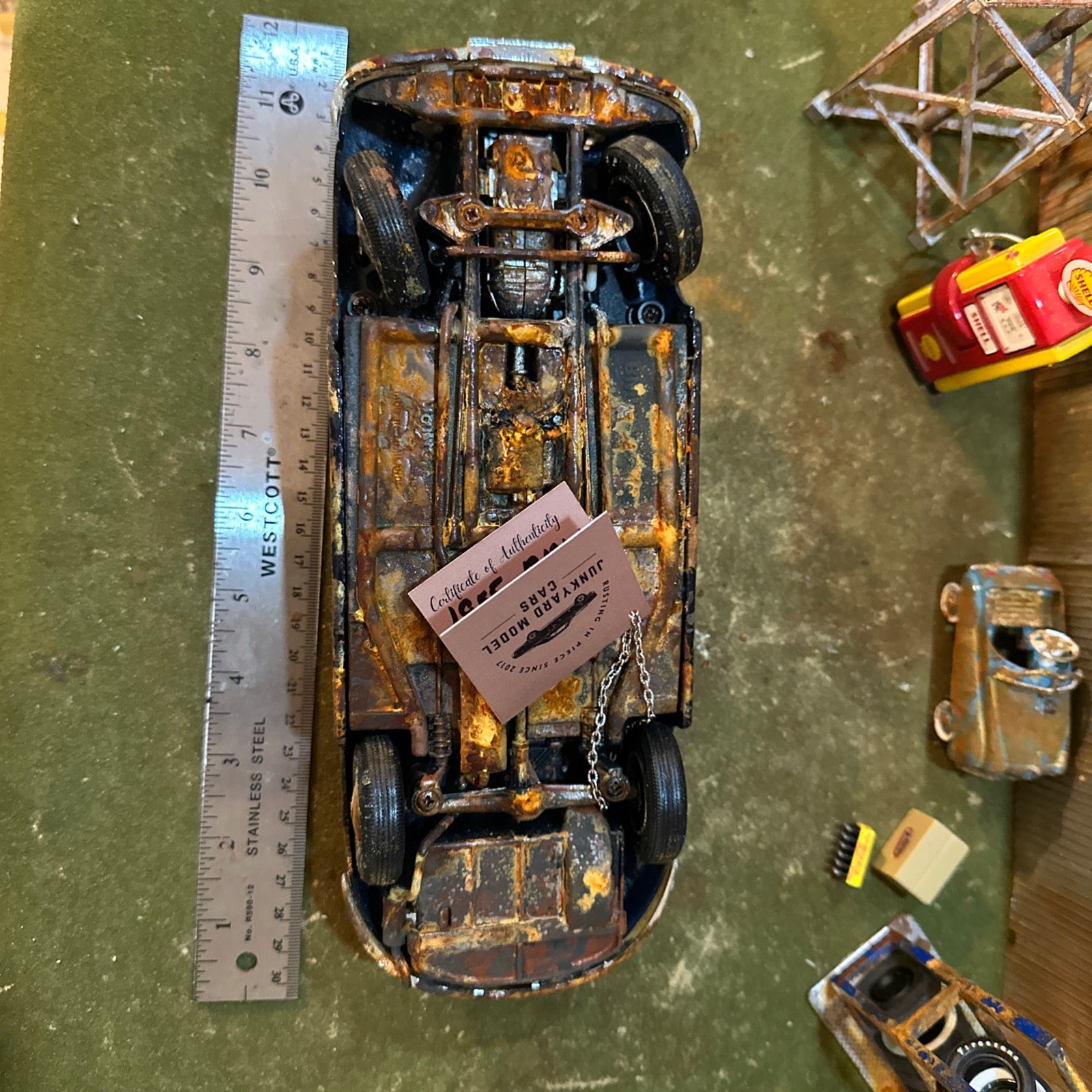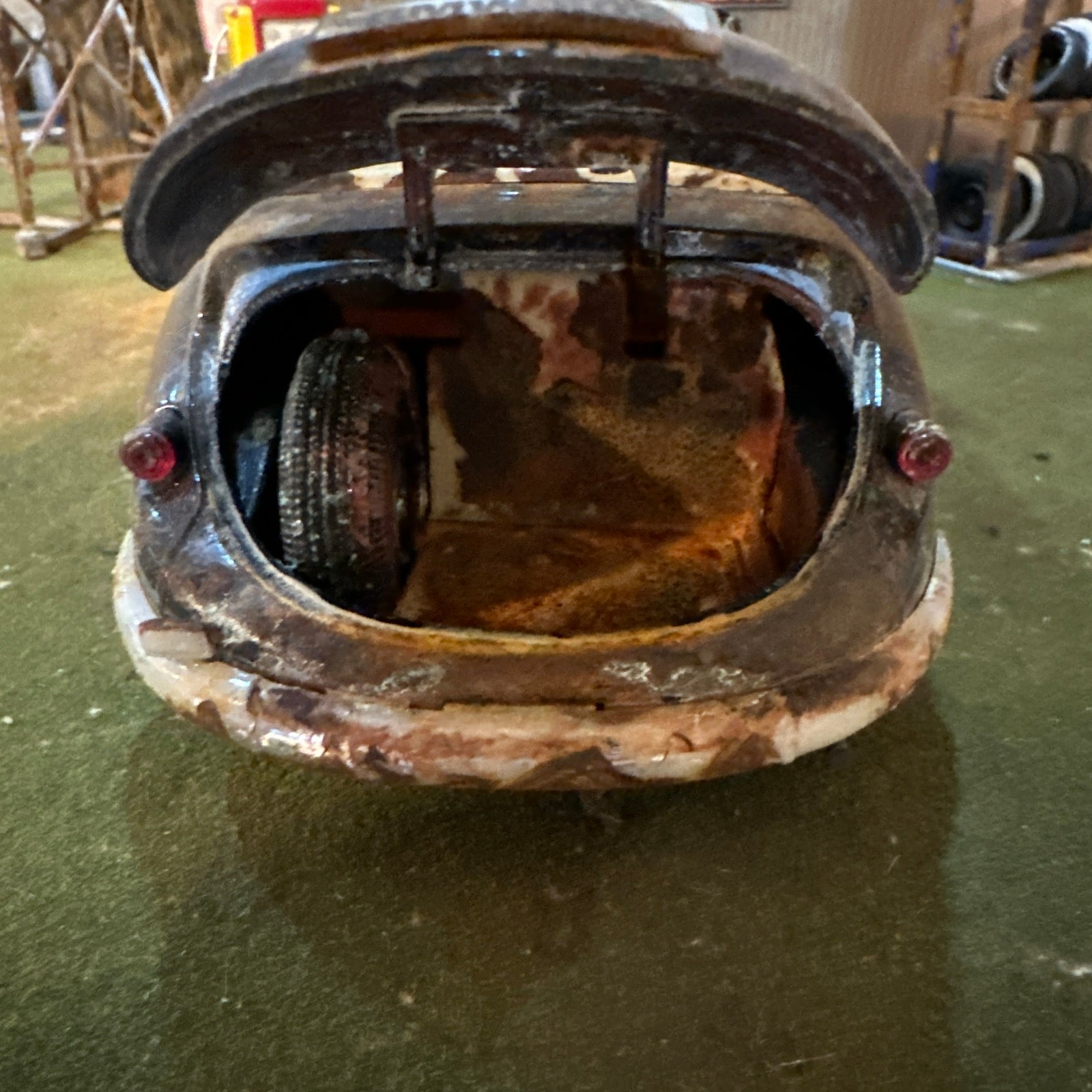 Using a Multi-step rusting process the artist redid the interior to show rotting then heavily rusted the body, interior, undercarriage, in the trunk and under the hood! The car is enhanced it with real rust so it would take on the appearance of a car left for discovery.