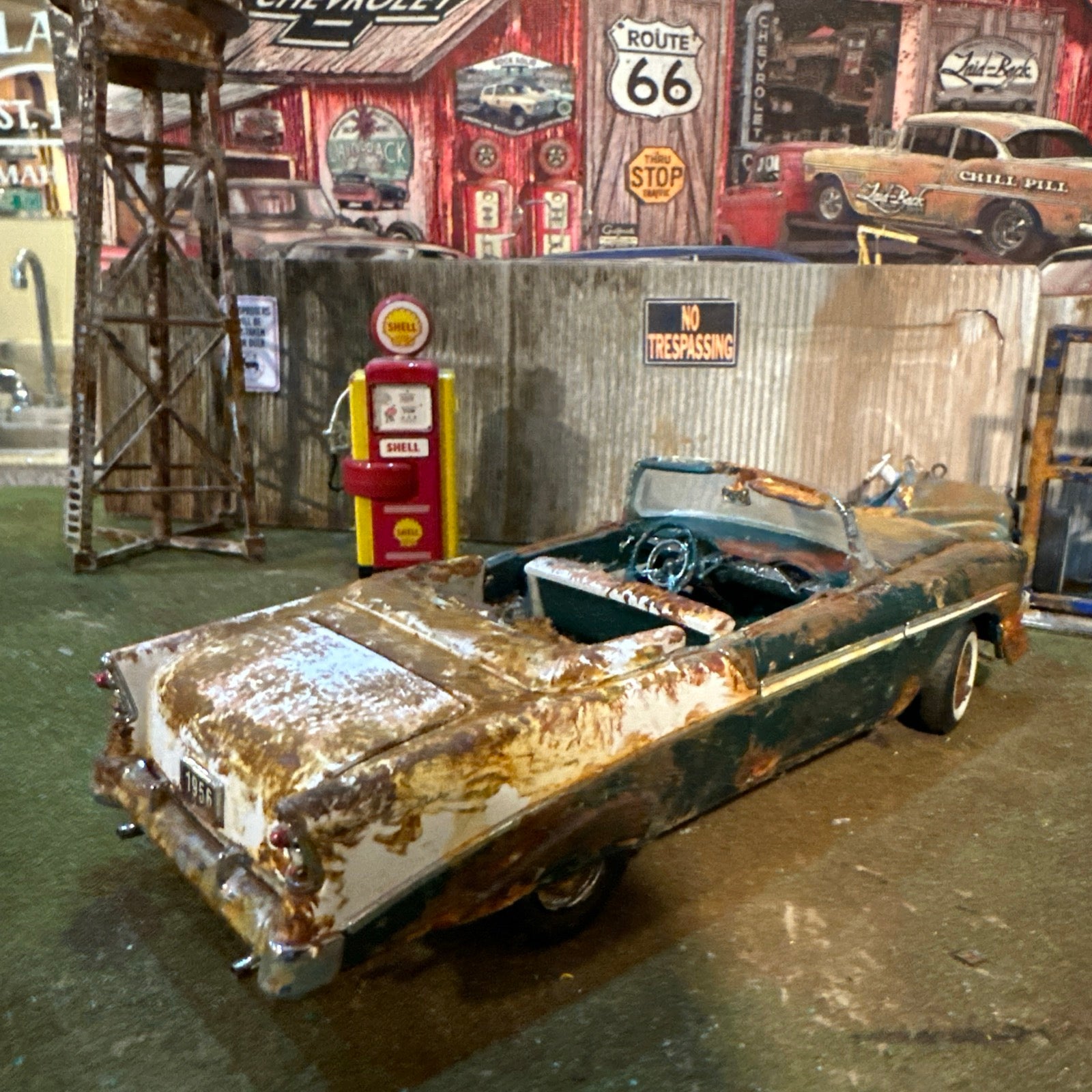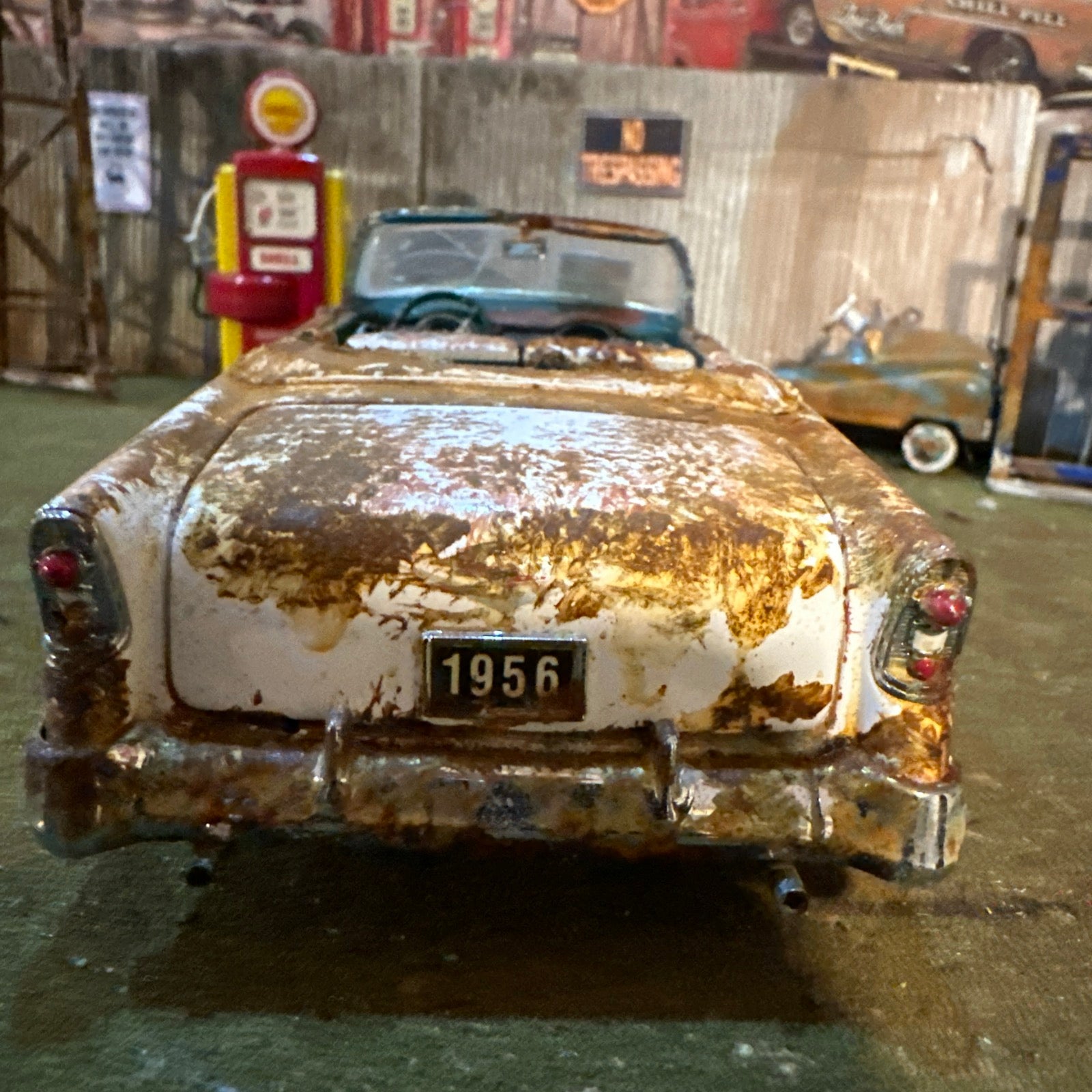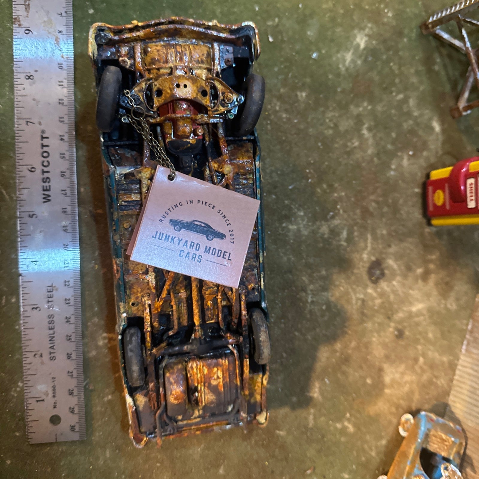 Starting with a very highly detailed 1/24 Franklin Mint scale DIECAST model the car was aged to perfection including a rotting chassis, interior, trunk and engine bay as well as paint decay. All done using a multi step rusting process.