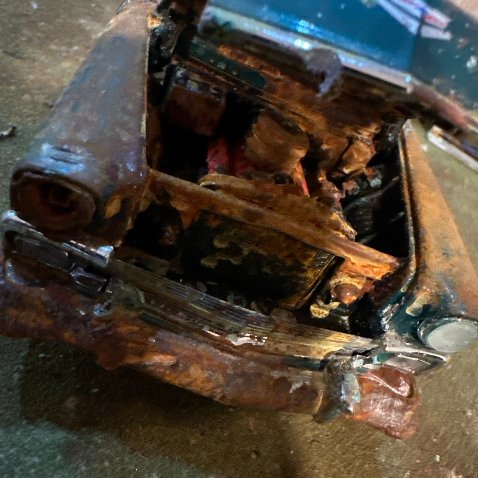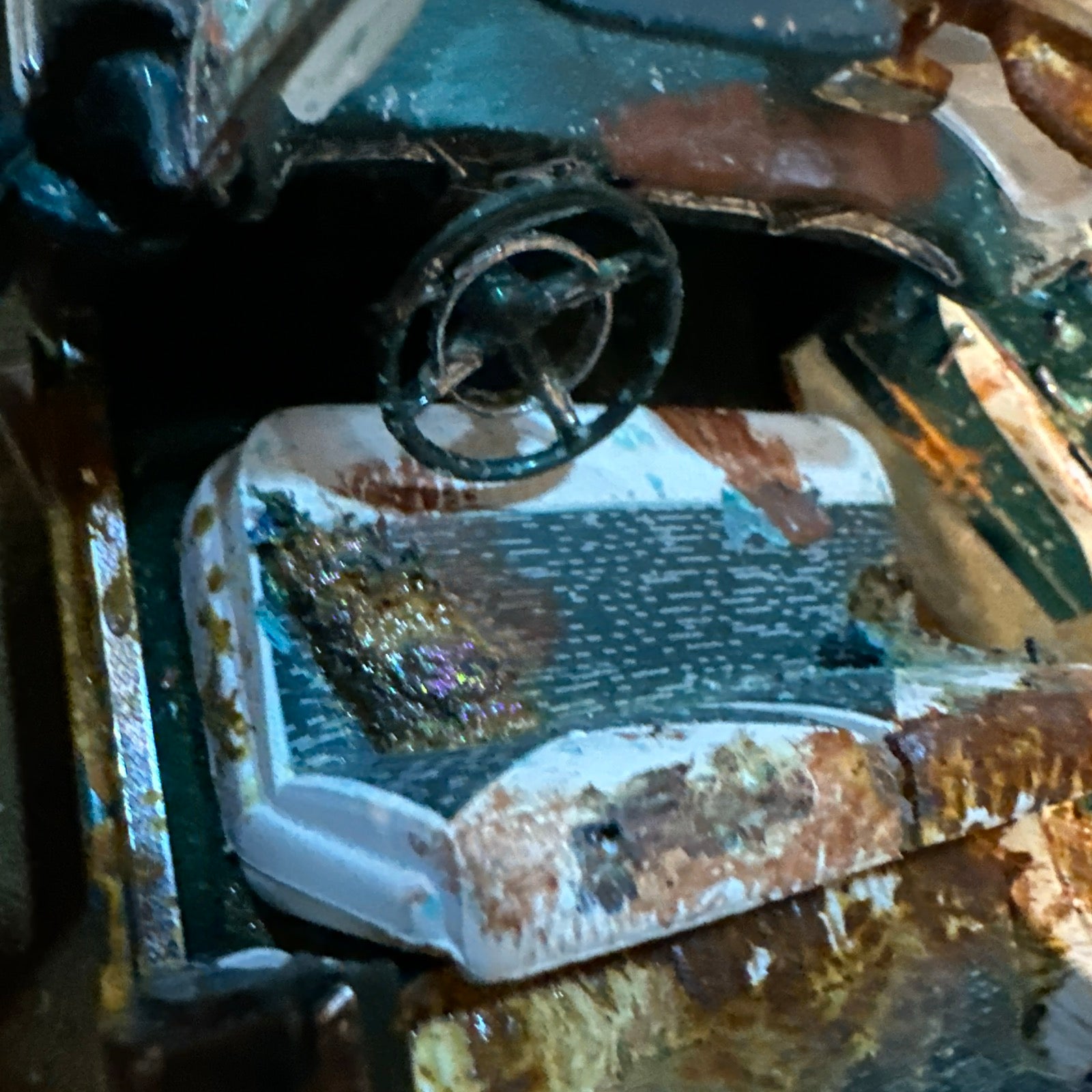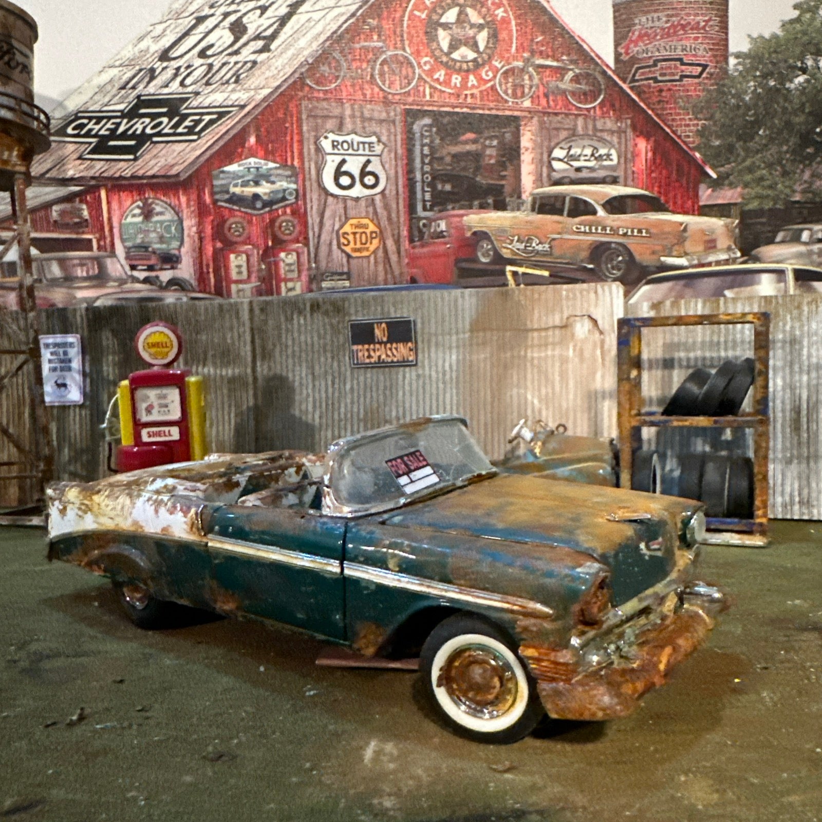 Starting with a very highly detailed 1/24 Franklin Mint scale DIECAST model the car was aged to perfection including a rotting chassis, interior, trunk and engine bay as well as paint decay. All done using a multi step rusting process.