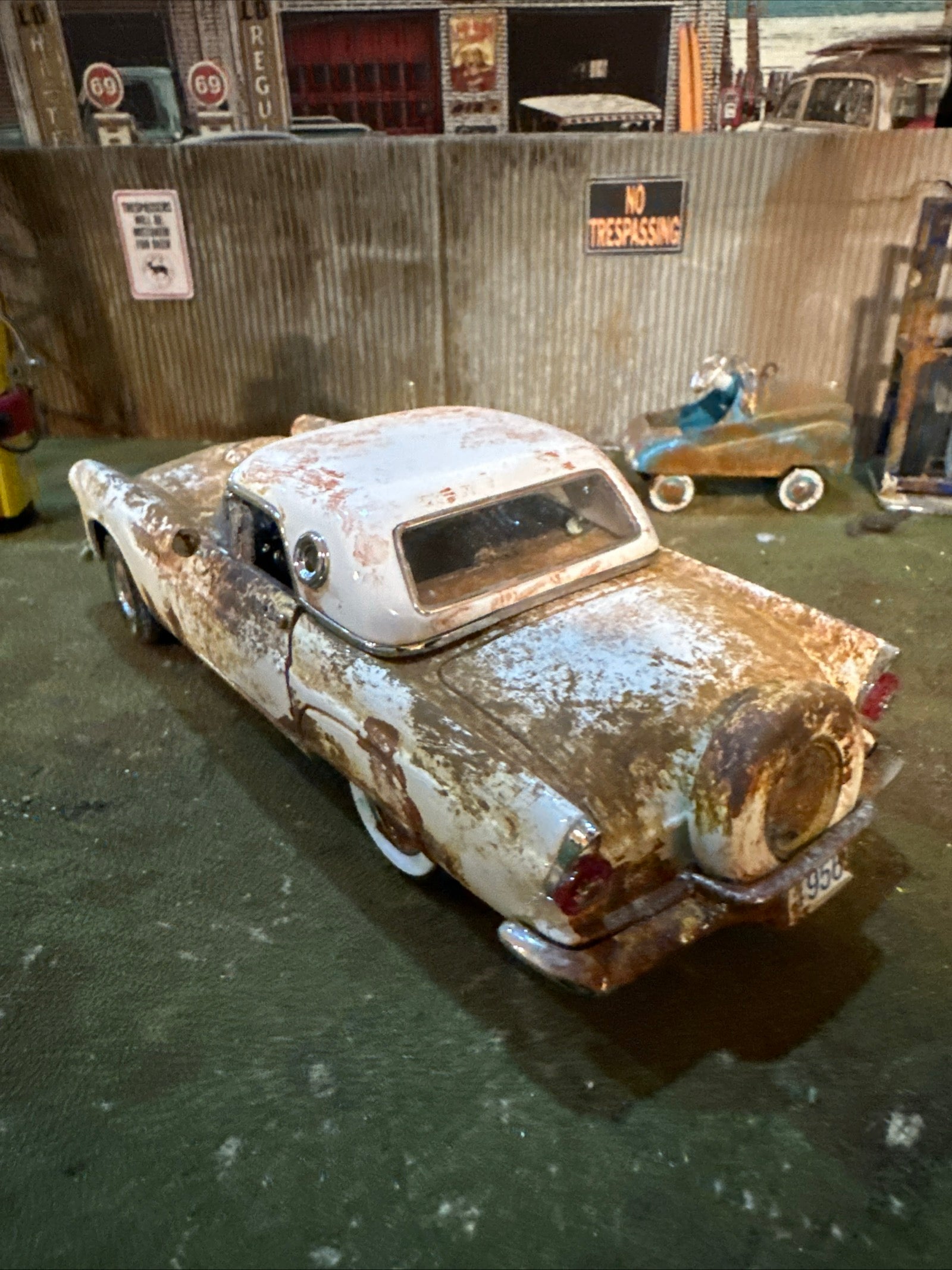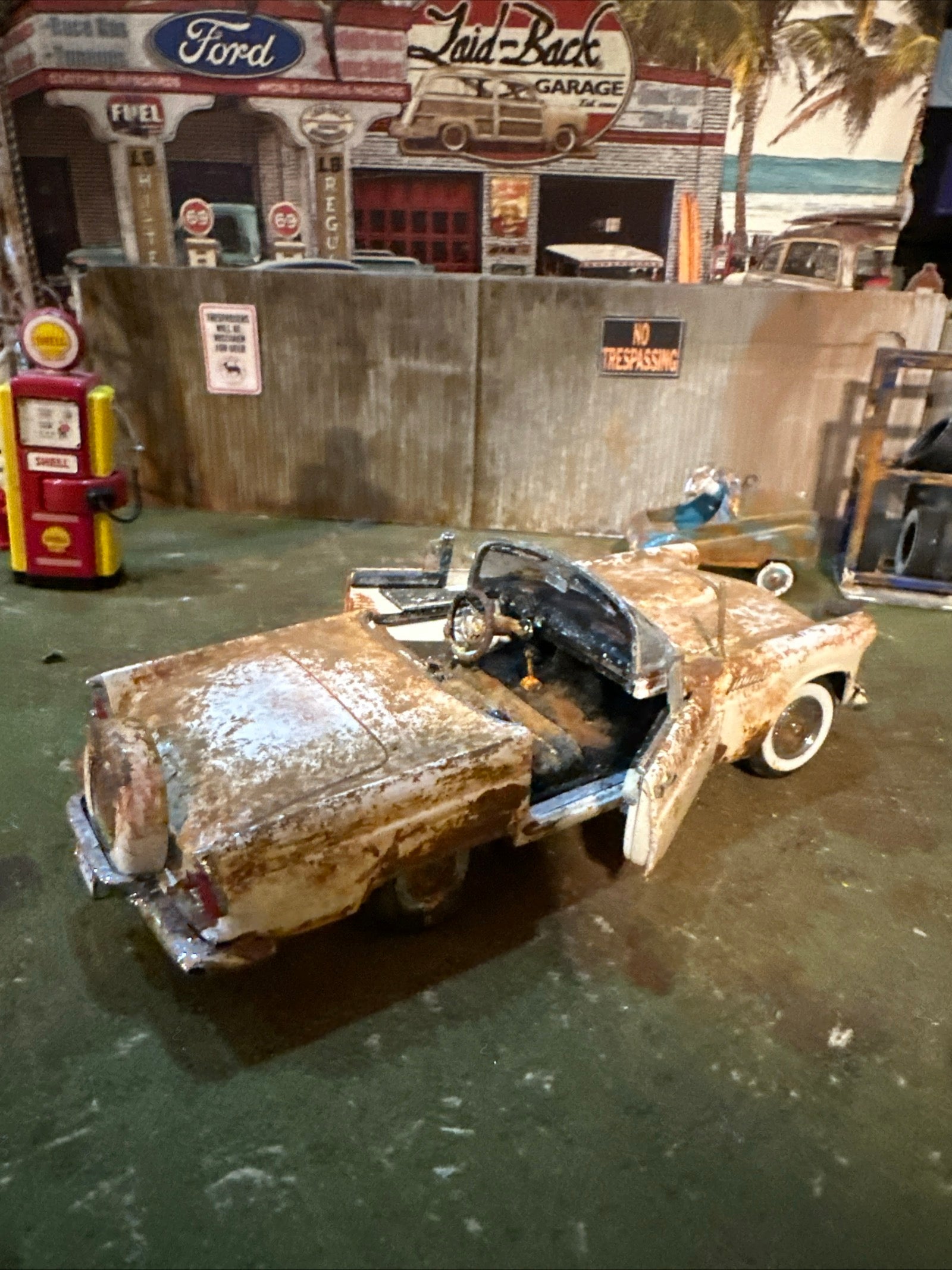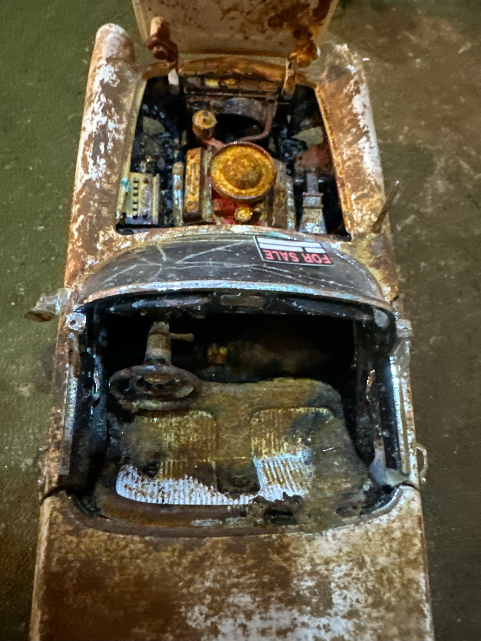 Starting with a very highly detailed 1/24 scale car by the Danbury Mint, the car was aged to perfection including a rotting interior chassis and engine bay using the multi step rusting process.