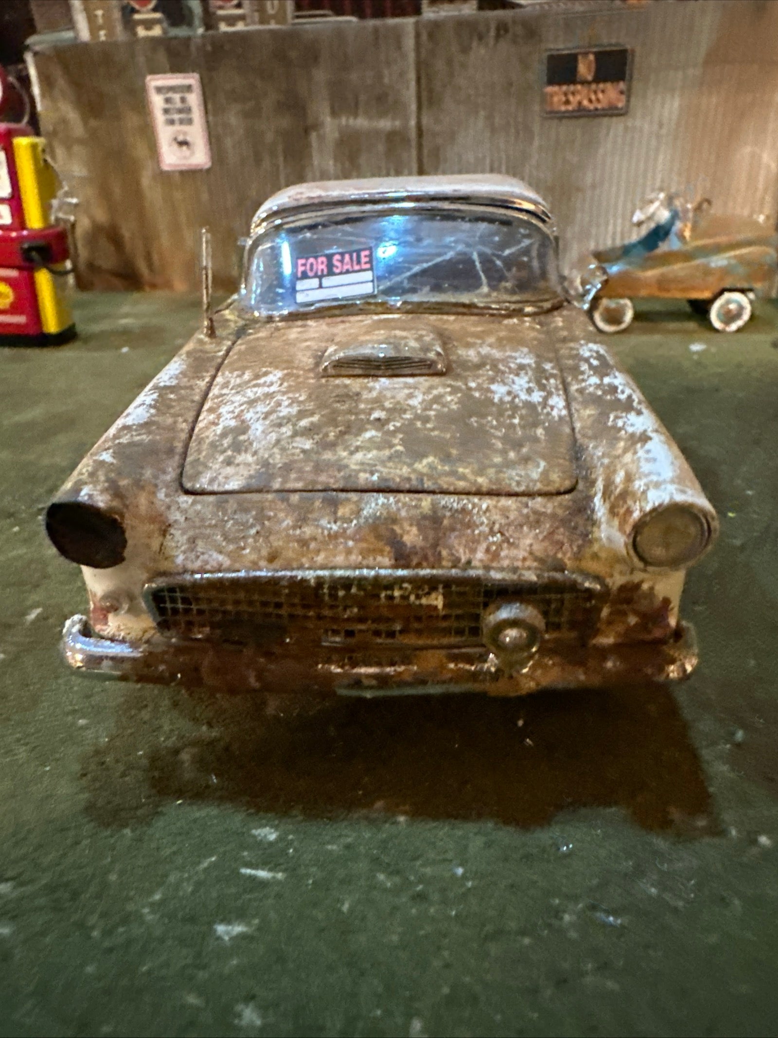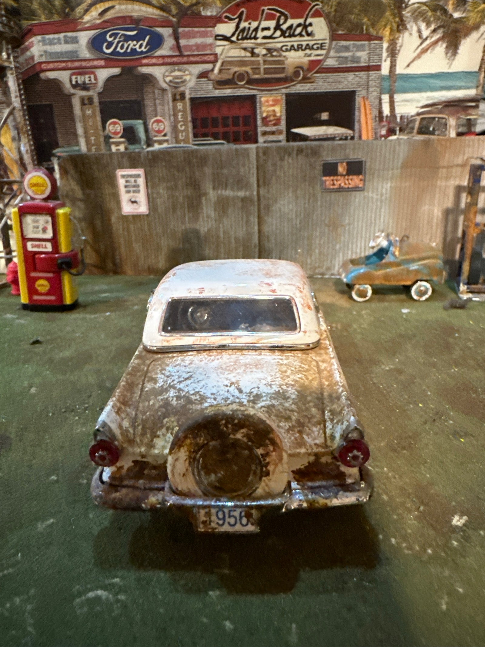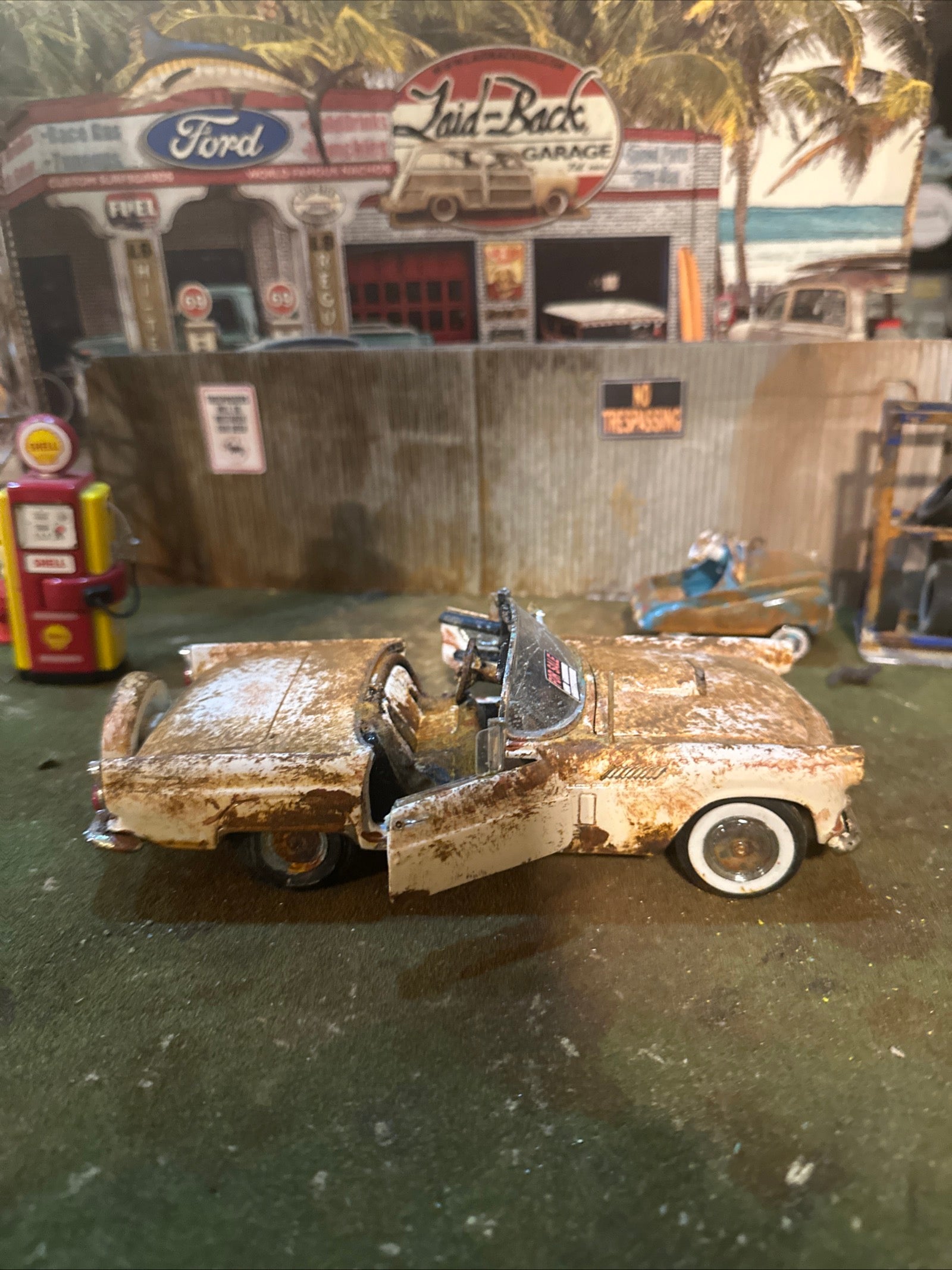 Starting with a very highly detailed 1/24 scale car by the Danbury Mint, the car was aged to perfection including a rotting interior chassis and engine bay using the multi step rusting process.