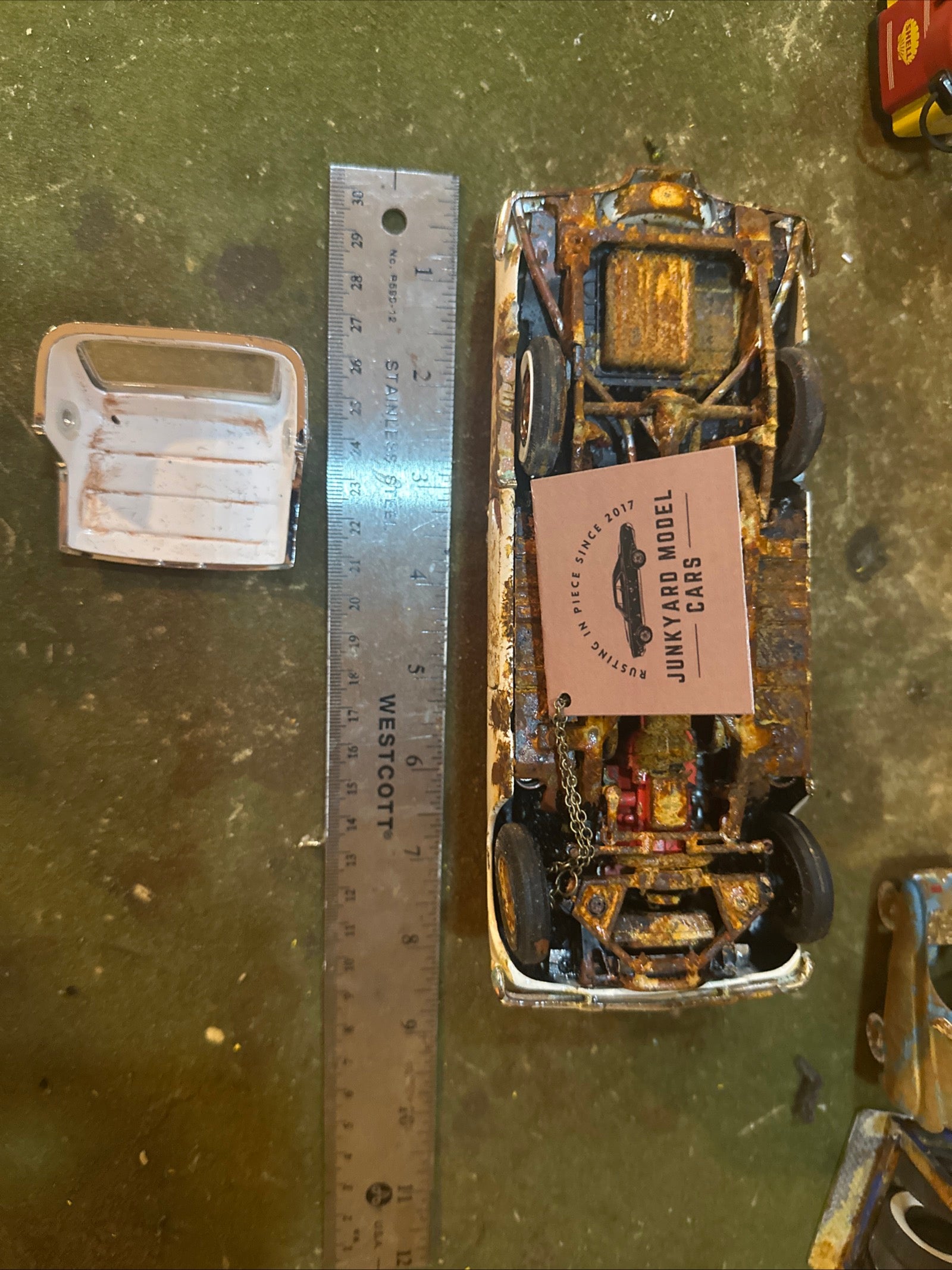 Don’t be fooled by others that use paint instead of real rust which takes longer but is worth it! You will see the difference between artistic work from a model car artist with 60 years of experience and a cheap knockoff from somebody that simply wants your dollar to come their way.