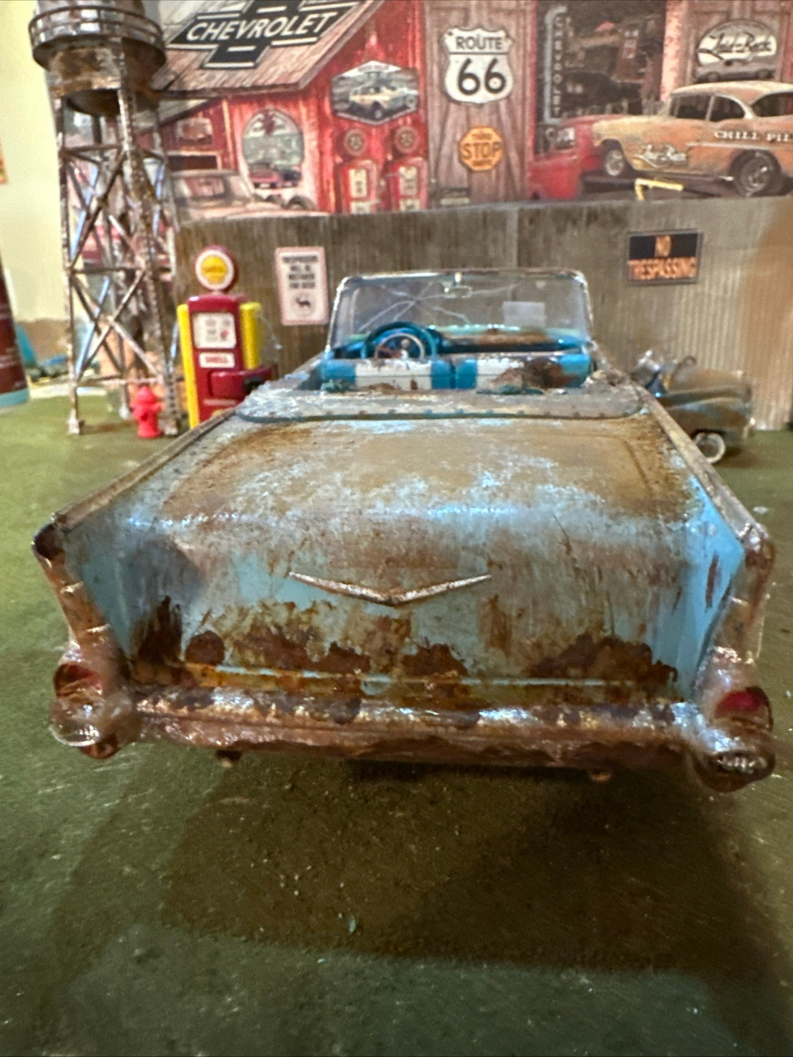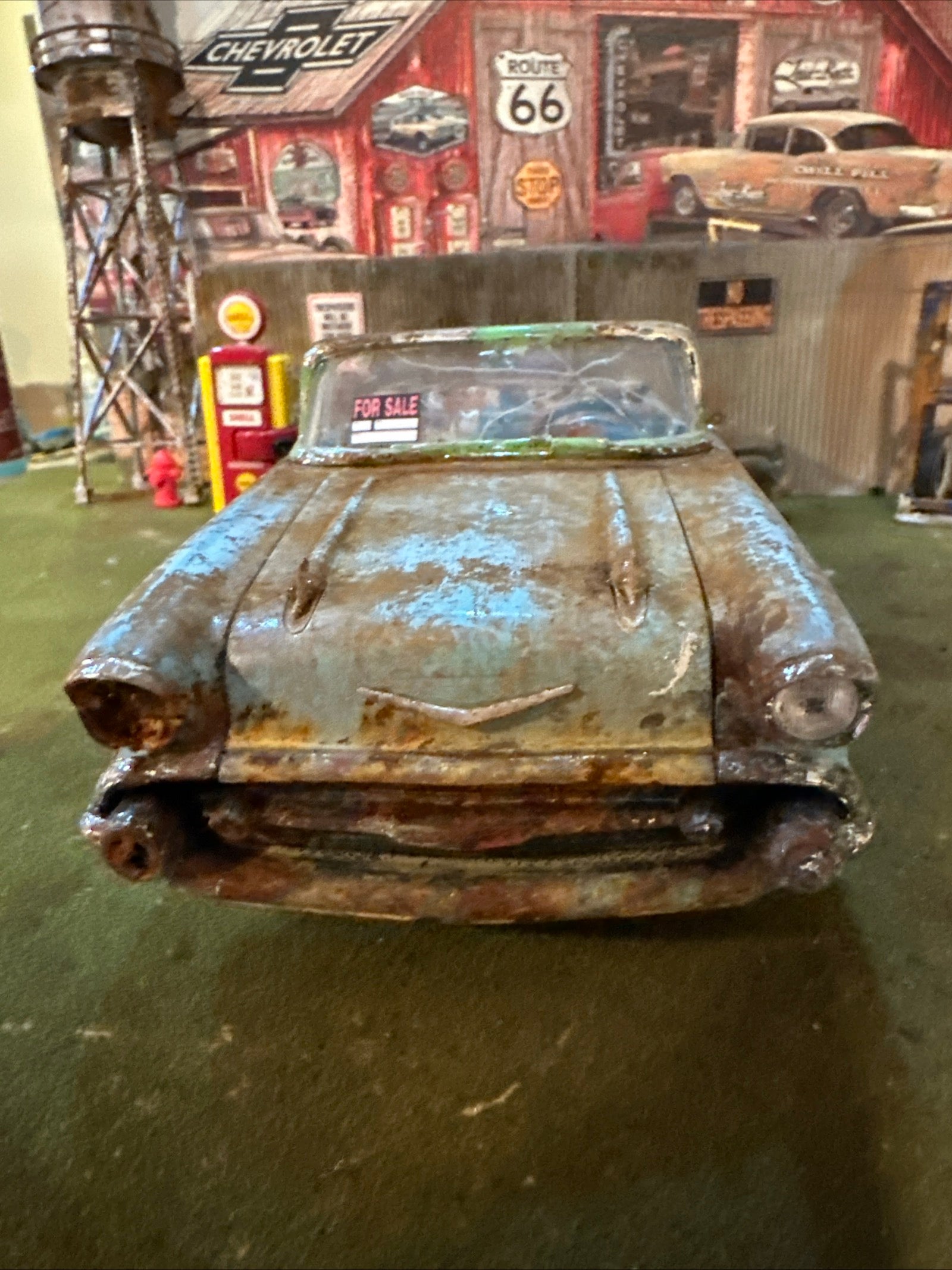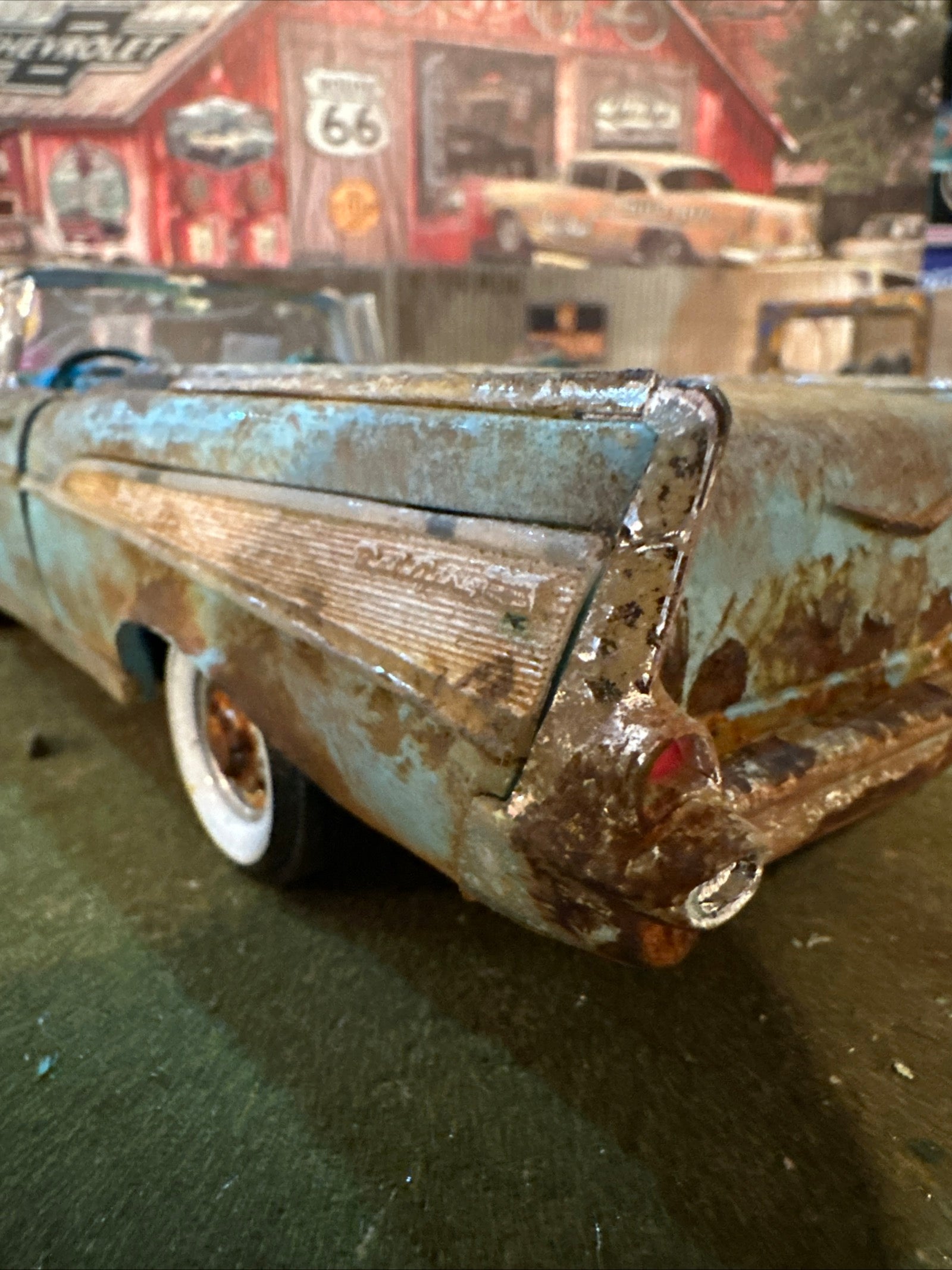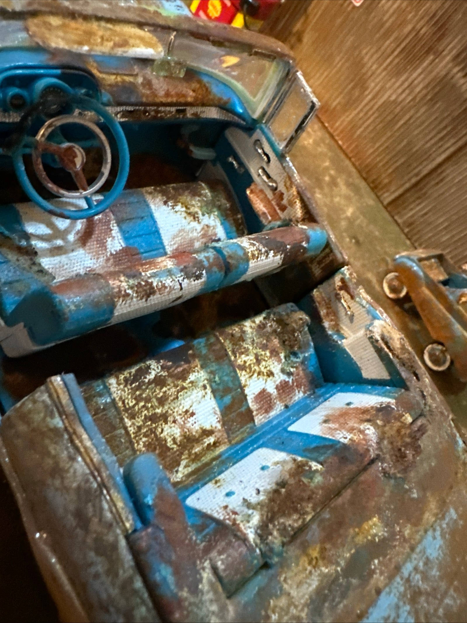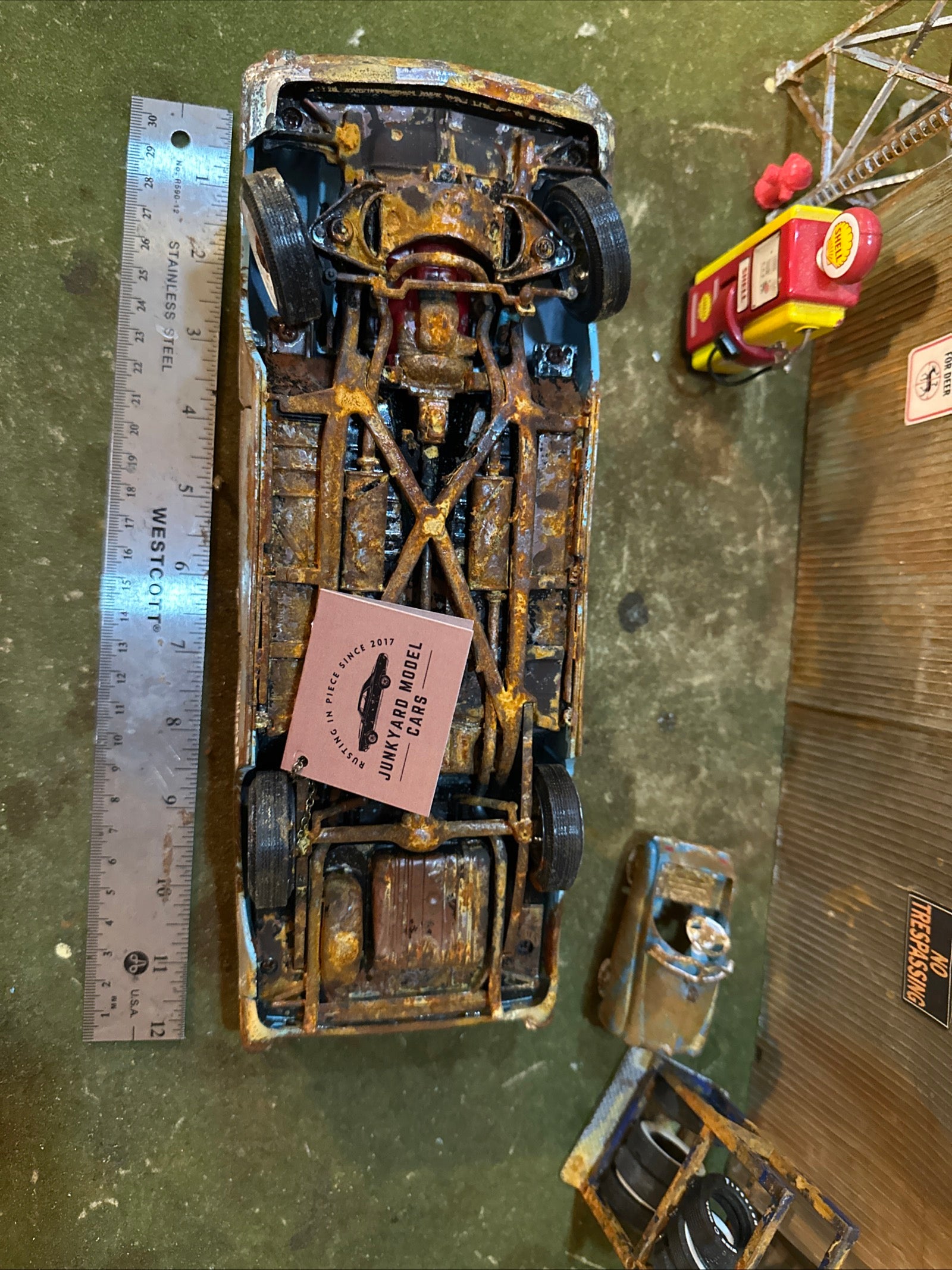 Starting with a very highly detailed 1:18 scale DIECAST model the car was aged to perfection including a rotting chassis, interior and engine bay as well as paint decay. All done using a multi step rusting process.