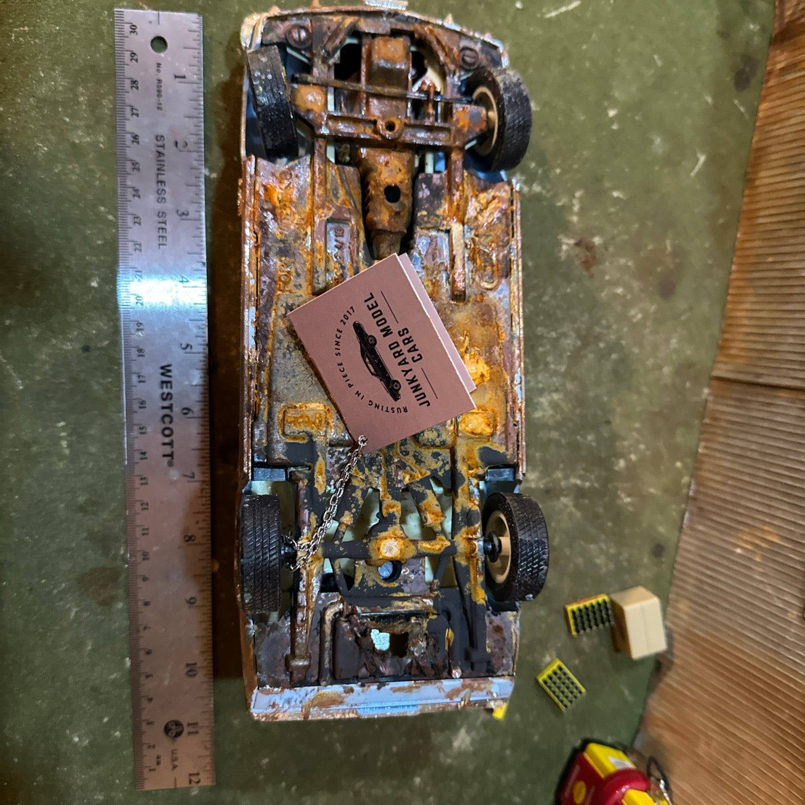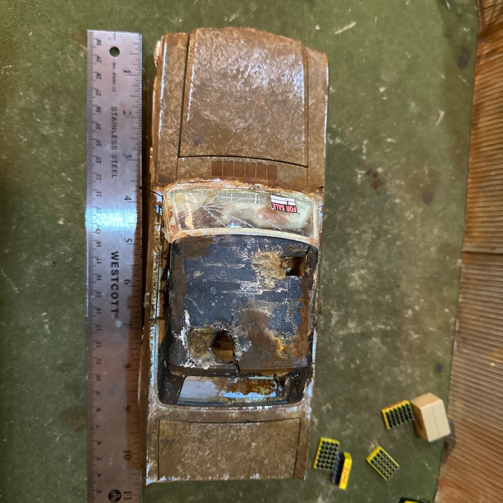 Using a Multi-step rusting process the artist redid the interior to show rotting then heavily rusted the body, interior, undercarriage, in the trunk and under the hood! The car is enhanced it with real rust so it would take on the appearance of a car left for discovery.